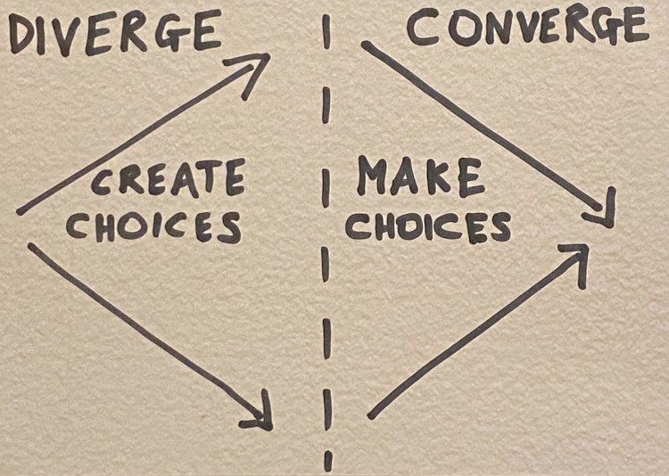 My analytical leanings means some of my best contributions are within convergence. Don’t get me wrong, I can come up with new ideas, I know how to use and continually strengthen that muscle, however, there’s also a real joy in adding flesh to the bones of an idea whether it’s yours or not. For example, I love weighing solutions against each other using something like an Impact vs Ease matrix in order to add some rigour to the choice stage. Because of all this I have felt underused, undervalued and disappointed when I’ve been part of processes which have spent hours on diverging only to follow with mere minutes converging.